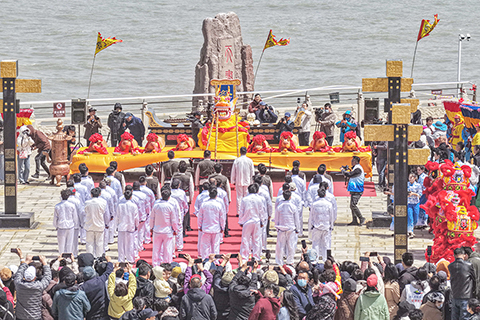 山東榮成:穀雨祭海祈豐收 2026-04-21 03:30:00 ◎ 四月二十日,穀雨時節,山東榮成成山頭景區舉辦祭海儀式,呈現漁民祈福的民俗盛況。穀雨祭海是山東膠東沿海地區傳統民俗,當地民眾以此祈願出海平安、漁業豐收。(無人機照片)(中新社發 李信君 攝)