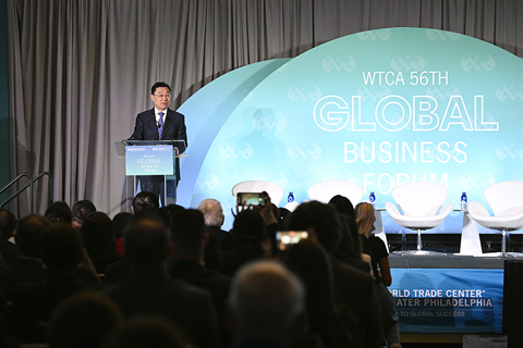 ◎ 四月二十日,在美國費城,中國駐美國大使謝鋒在第五十六屆世界貿易中心協會全球商業論壇開幕式上發表主旨演講,讓中美經貿科技合作回歸常識與理性。(新華社記者 李睿 攝)