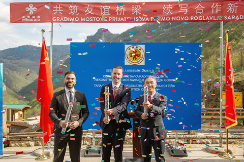 ◎ 黑山總理斯帕伊奇四月二十日出席中國援建黑山塔拉河大橋修復項目復工儀式時對中方表示感謝,並稱讚這一修復項目是「工程領域的傑作」。塔拉河大橋修復項目由中國山東高速集團承建,是中國企業在黑山的重要基礎設施工程之一。項目工程涵蓋大橋病害修復、南北兩岸接線道路改造、交通安全設施修復完善、停車場設置等。圖為當日,在黑山扎布利亞克,黑山總理斯帕伊奇(中)出席中國援建黑山塔拉河大橋修復項目復工儀式。(新華社記者 石中玉 攝)