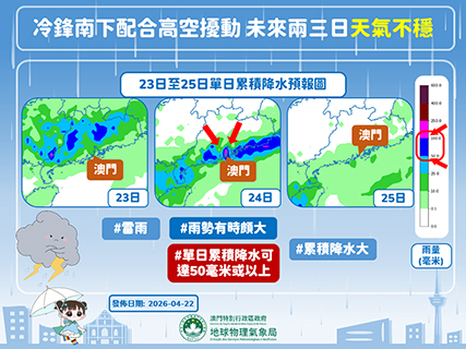 氣象局表示,春季最後一個節氣「穀雨」已過,近日雨水亦有增多。預料本周中期開始,華南地區天氣轉趨不穩定。預料一道低壓槽將逐漸發展為冷鋒,並於周四(二十三日)南下影響廣東沿岸,屆時本澳驟雨增多,雨勢有時頗大及有雷暴。此外,受高空擾動影響,周五(二十四日)至周六(二十五日)初時,持續有頻密驟雨及幾陣雷暴,單日累積降雨量可達五十毫米或以上。
