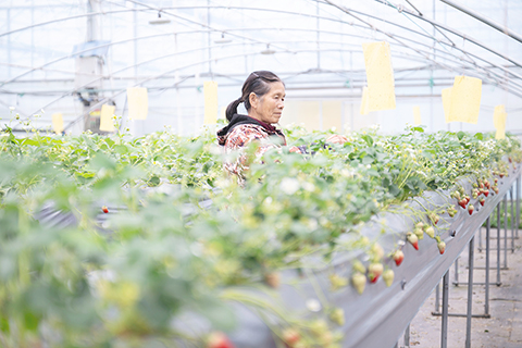 六十八歲的王阿姨曾是貧困戶,如今在杏福園的大棚里照料蔬果,每月能有二千餘元收入,每年還有五千餘元土地流轉費。「這份工作不用日曬雨淋,比在家閒著強多了。」