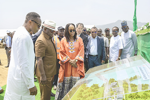 ◎ 中國援建的塞拉利昂漁碼頭項目海上工程四月二十三日在該國西部地區布萊克.約翰遜村舉行啟動儀式。該項目建成後有望提升當地漁業現代化水平,帶動就業增長,改善民生福祉。圖為當日,在塞拉利昂西部地區布萊克.約翰遜村,塞拉利昂總統比奧(左二)在中國援建的塞拉利昂漁碼頭項目海上工程啟動儀式上參觀項目沙盤模型。(新華社發中國鐵建港航局集團有限公司供圖)